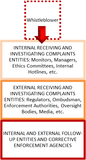 A whistleblowing system includes: the individuals that come forward to report a wrongdoing; entities that register and process the disclosure; entities that impose sanctions and take corrective measures; entities who protect the whistleblower; and actors who promote and support the benefits of whistleblowing.